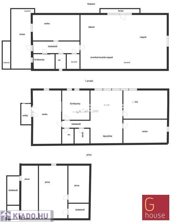 A nappaliból vezet az emeletre a lépcső, ahol egy nagy és két kisebb hálószoba található. A nagyobb szobához kis udvarra néző erkély csatlakozik. A pihenőből kis folyosón keresztül vezet az út a nagy sarokkádas fürdőszobába. (Szemben a wc bidével.) (Mindkét fürdőben mosógép kiállás van, felső szinten mosógéppel.)