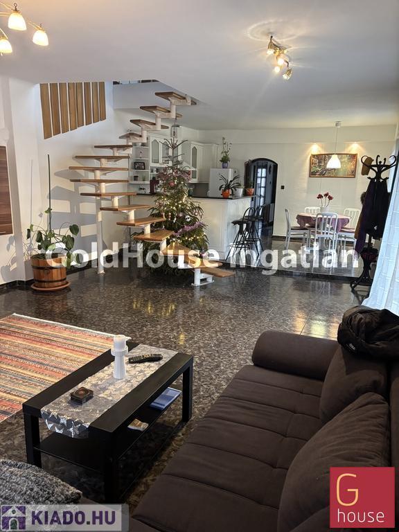 Két szintes. Alul egy 54 nm-es nappali, egy jól felszerelt amerikai konyhával, étkezővel és egy közlekedővel csatlakozó lakrész egy szobával, fürdővel. (Külön wc). A nappaliban élmény kandallós fűtőtest.