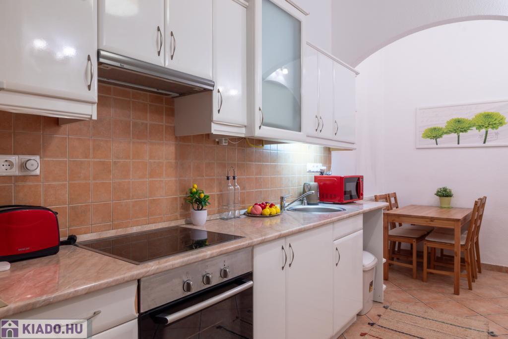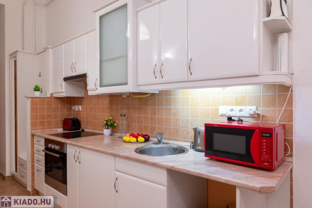 Külön konyha étkezővel, modern beépített bútorokkal, teljesen gépesítve (hűtő, sütő, főzőlap, mikró stb.)