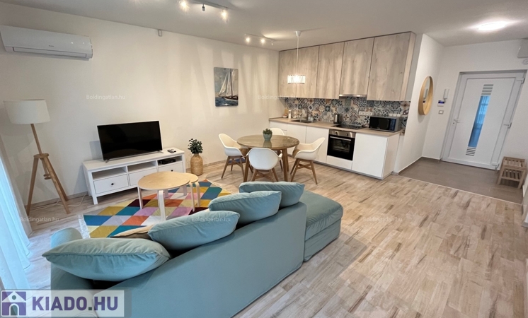 2026.05.31-IG!!! Balatonlellén a központ közelében, - a parttól nem messze - rendezett társasház 1. emeletén található, 48 m2-es - igényesen kialakított és berendezett - modern lakás kiadó. A lakásban előszoba-étkező-nappali, 1 szoba, fürdőszoba-wc helyiségek találhatóak, illetve a nappaliból kilépve nagy terasz is van. A fűtése légkondicionálokkal megoldott, továbbá riasztó is van felszerelve - a lakáshoz tartozik 1 db személyautó részére beállóhely is. A tulajdonos a lakást legfeljebb 2 felnőtt személy részére kívánja bérbe adni, a dohányzás és a kisállat tartása nem engedélyezett. Bérleti díj: 150.000.- Ft/hó + rezsi + 2 havi kaució
