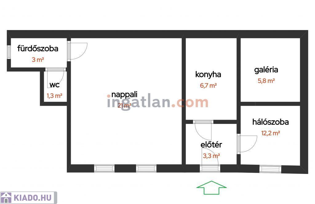 nappali (21 nm), konyha (6,7 nm), hálószoba (12,2 nm), galéria (5,8 nm), előszoba (3,3 nm), fürdőszoba (4,3 nm).