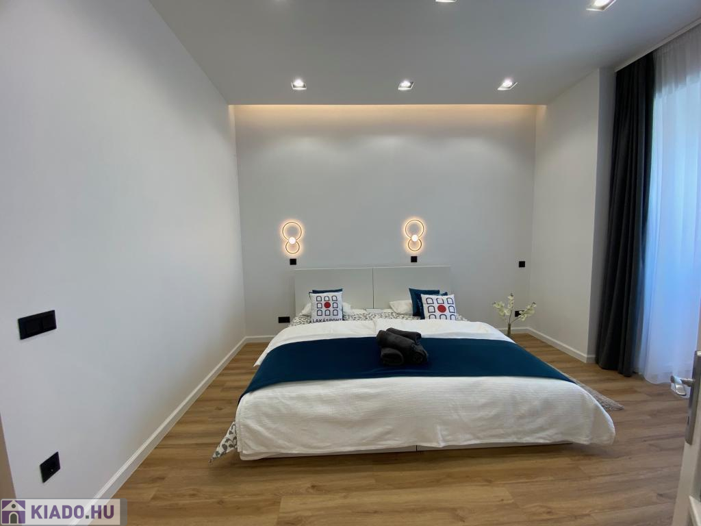 A nappaliból elérhető hálószoba nyugodt, csendes légkört biztosít, a hozzá kapcsolódó, külön gardróbhelyiség pedig praktikus és stílusos megoldás minden igényes bérlő álma.