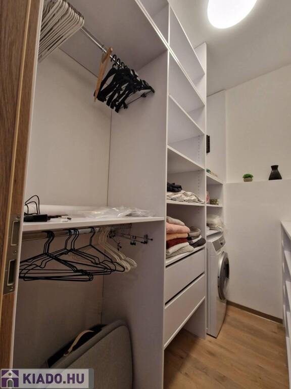 Külön gardróbszoba polcokkal, akasztókkal, cipőtartókkal és mosógéppel