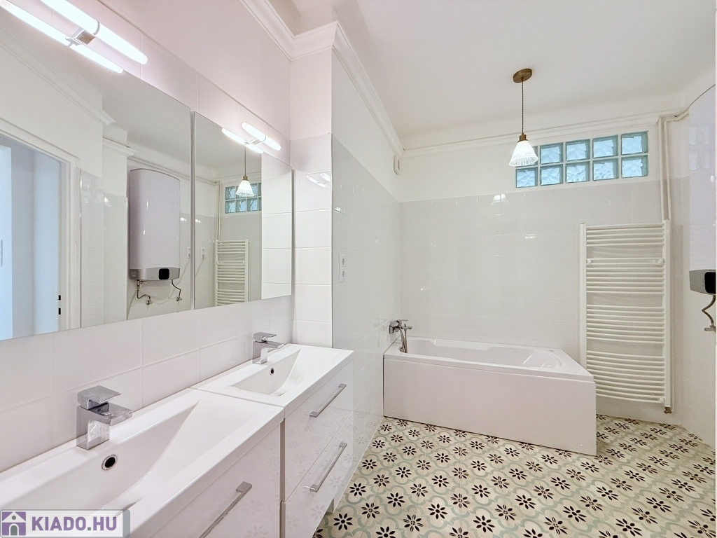 A fürdőszoba kádas kialakítású, törülköző szárítós radiátorral, fiókos szekrényekkel épített mosdókkal felszerelt, ahol a lakás meleg víz ellátását biztosító, új villanybojler is helyet kapott.
