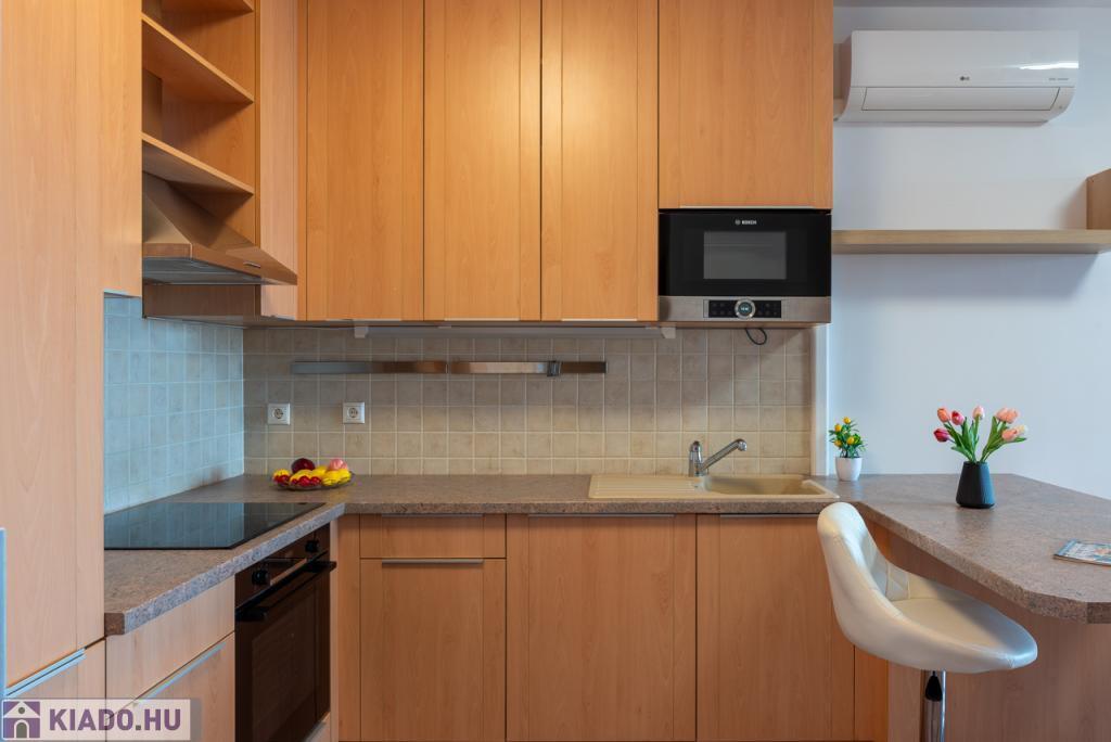 A modern, gépesített konyha prémium minőségű Bosch készülékekkel felszerelt (beépített hűtő, fagyasztó, mosó-szárítógép). Praktikus külön kamra van. A beépített szekrények és polcrendszerek rengeteg tárolási lehetőséget kínálnak.
