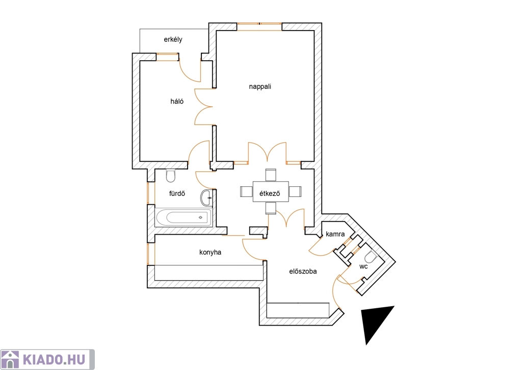 A lakás elrendezése: előszoba, különálló konyha, étkező, nappali, 1 hálószoba, WC, fürdőszoba, erkély.