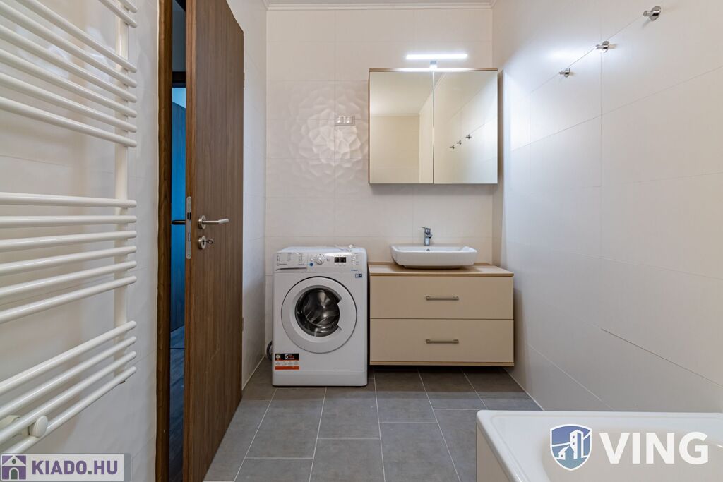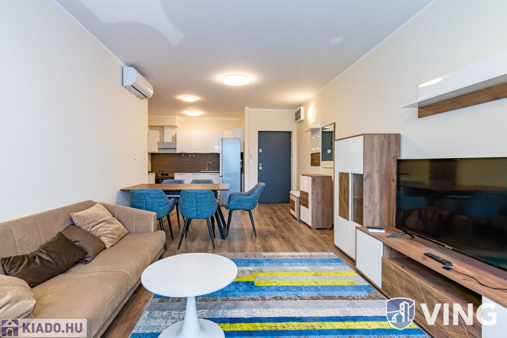 A lakás a képeken látható prémium bútorokkal és gépekkel van esztétikusan berendezve.