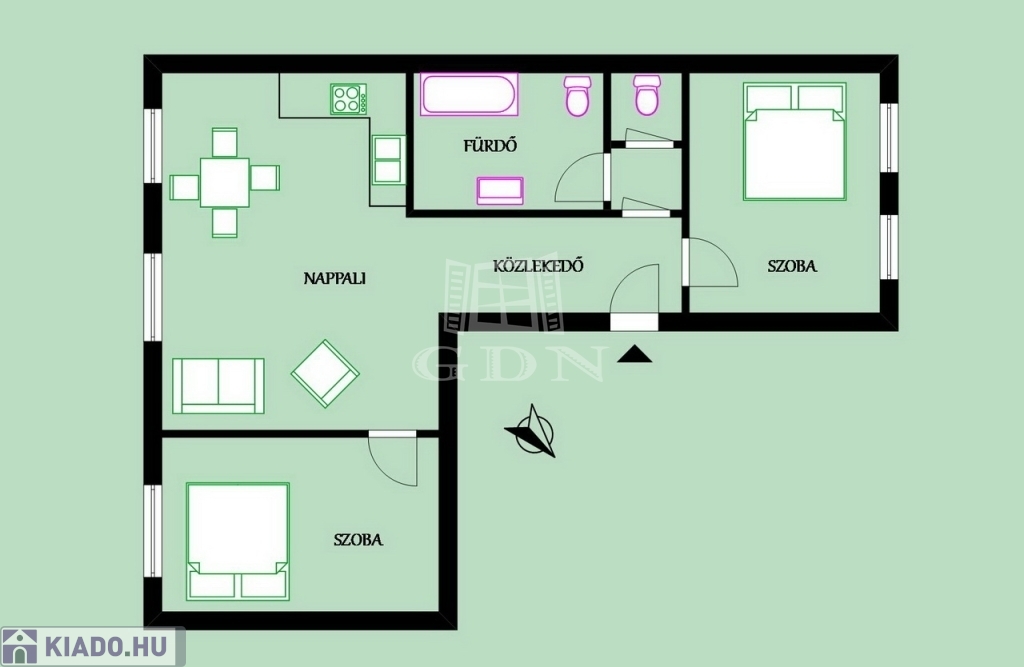 A 75 nm-es lakás az épület 2. emeletén található. A bejárati ajtóval szemben van a fürdő és a külön WC, jobbra az egyik háló, balra az amerikai konyhás nappali és a másik háló található. a fürdőben járólap, a többi helyiségben parketta fedi a padlót.