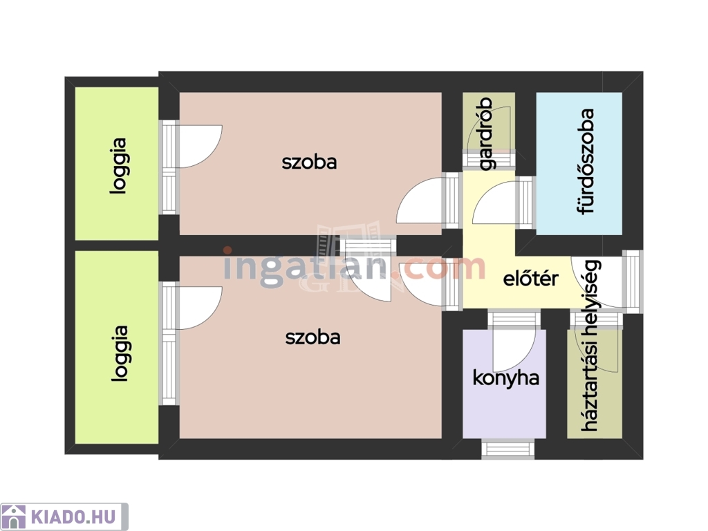 szoba, szoba, hall, fürdőszoba-wc, konyha-étkező, közlekedő-előtér, kamra, gardrób;