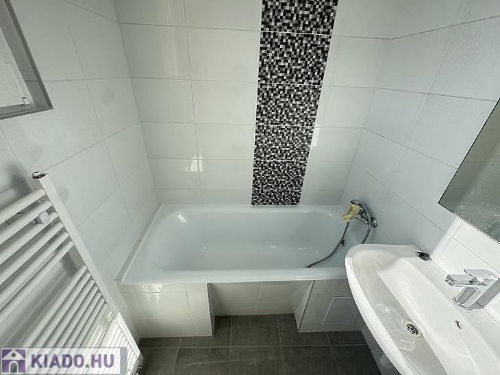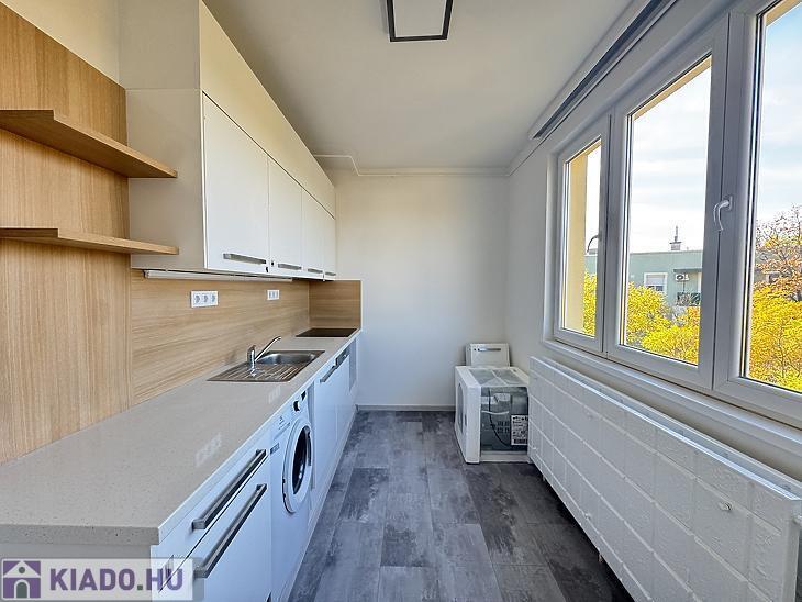 A konyha gépesített, mosógéppel és mosogatógéppel felszerelt, a sütő beépítése pedig hamarosan megtörténik. A folyosón praktikus beépített szekrénysor található. A fürdőszoba kádas kialakítású, törölközőszárítóval ellátva, a WC külön helyiségben kapott helyet. A lakás bútorozatlan, novembertől költözhető.