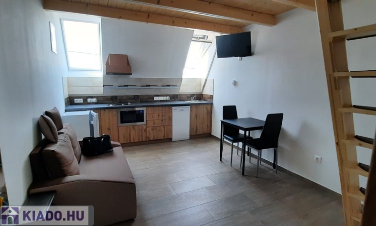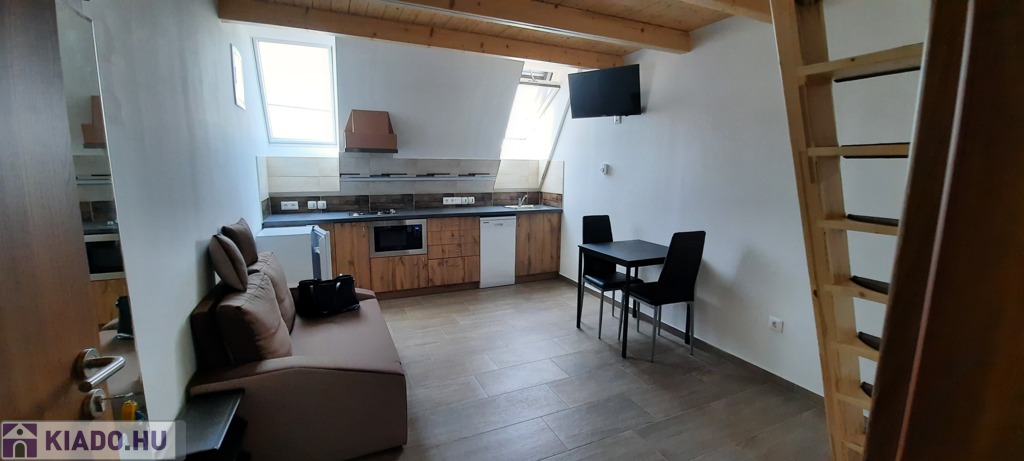 A tetőtéri lakásban a konyha teljesen felszerelt, mosogatógép, mikró, 2 lapos gáz. Az asztal, székek, hűtő, TV .