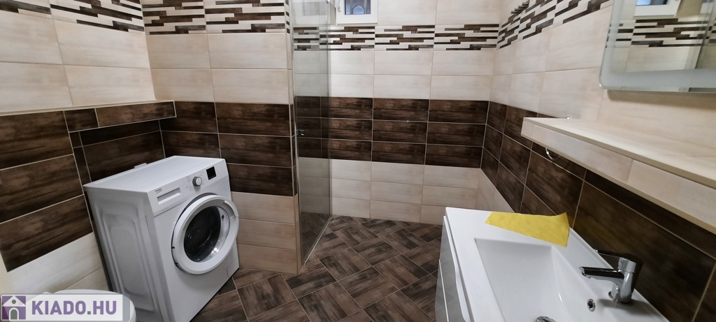 A fürdőszoba zuhanyzós kivitelű, mosógép van.