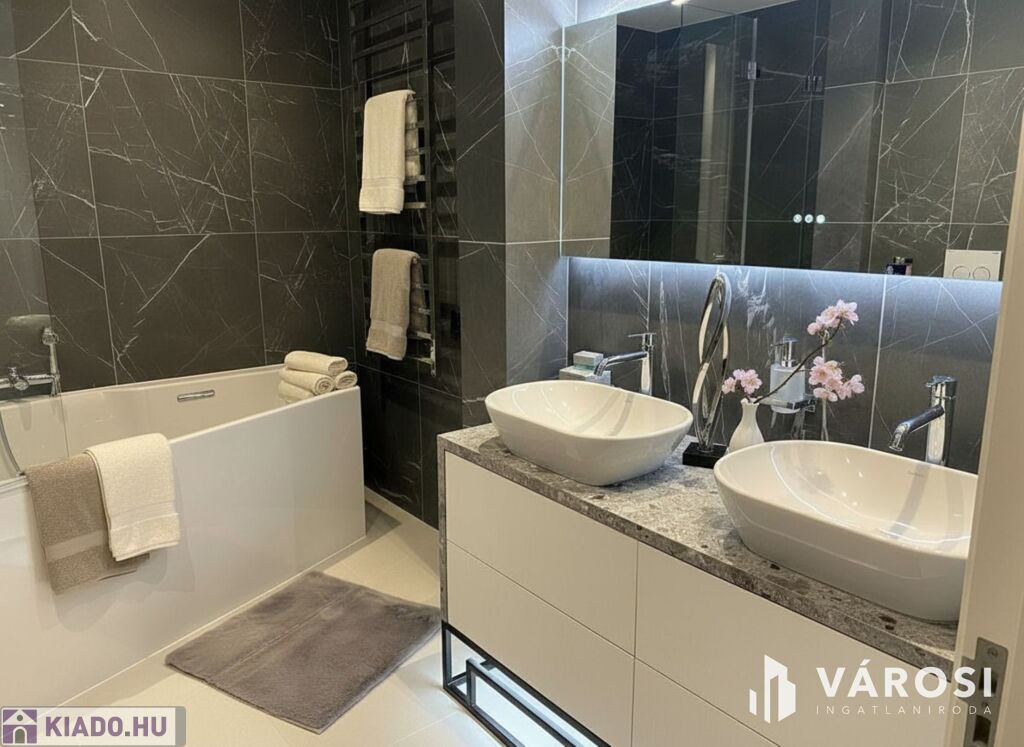 - **Fürdőszoba:** Az ingatlanban egy elegáns, kádas fürdőszoba dupla mosdóval és egy különálló WC is található, Geberit AquaClean Tuma Comfort, bidé funkciós WC-vel