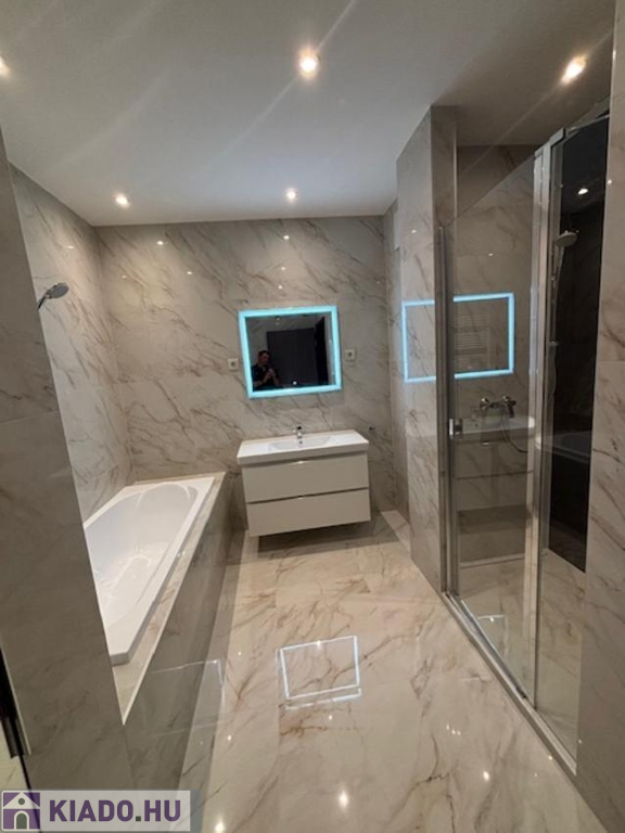 A fürdőszoba ( zuhanyzós és fürdökádas), ahol külön beépített szekrényben "Mille" mosó és szárítógép található! A nyílászárók távirányítós, motoros működtetésű, alumínium redőnnyel felszereltek és szúnyoghálóval ellátottak.