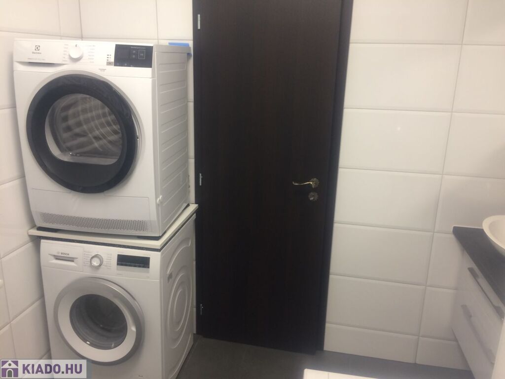 A fürdőszoba zuhanyzóval, káddal, mosó és szárítógéppel felszerelt, külön wc kézmosóval, a konyha elektromos főzőlappal és mosogatógéppel is ellátott.