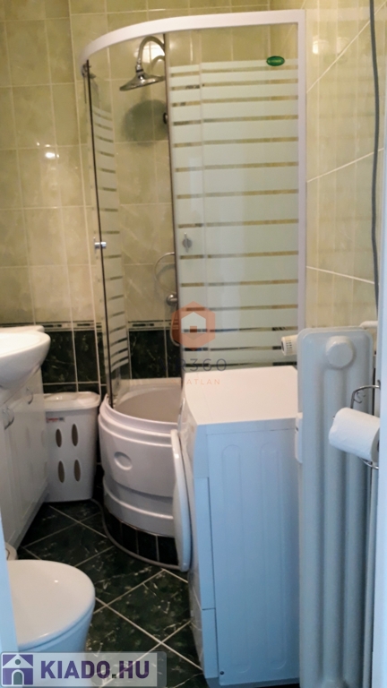 Fürdőszoba zuhanykabinnal és mosógéppel