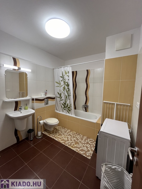 A lakásba lépve egy előszobába jutunk, melyből balra nyílik a káddal és mosógéppel ellátott fürdőszoba.