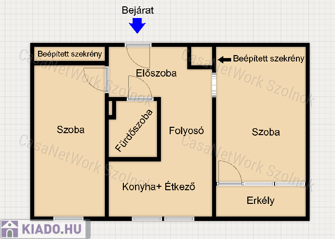 - rendelkezésre álló helyiségek: két szoba, konyha, fürdőszoba + WC, előtér, folyosó, erkély