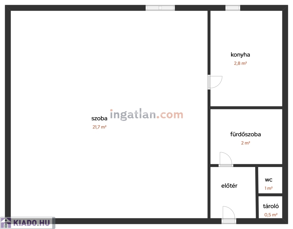 szoba 18,00m2, fürdőszoba 2,00m2, konyha-étkező-nappali 4,00m2, közlekedő-előtér 3,00m2, wc 1,00m2;