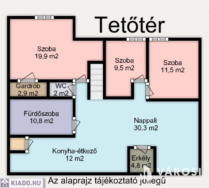 A ház lépcsőházából közelíthető meg, teljesen szeparált az alatta lévő szintektől.