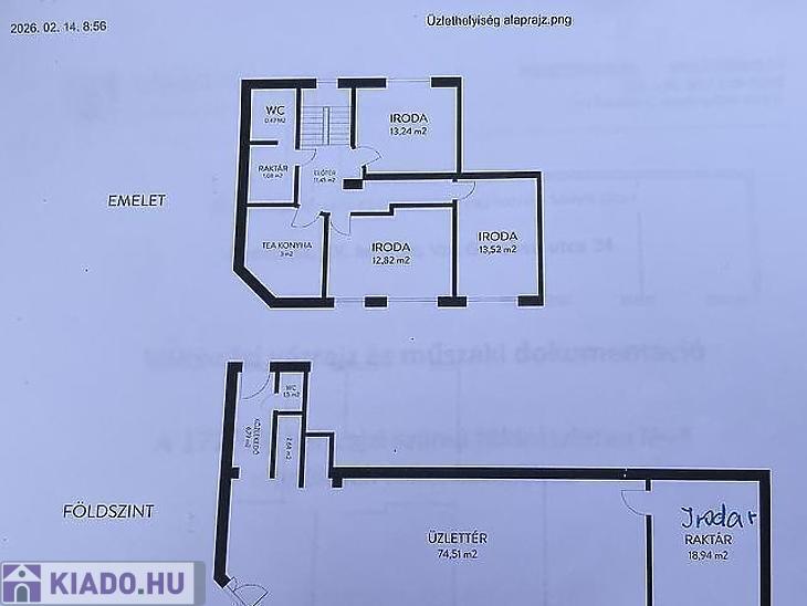 Az 56 m²-es emeleten két különálló irodahelyiség, egy teakonyha, egy mosdó, valamint egy kisebb raktár található, így az emelet ideális adminisztratív vagy irodai funkciók ellátására.