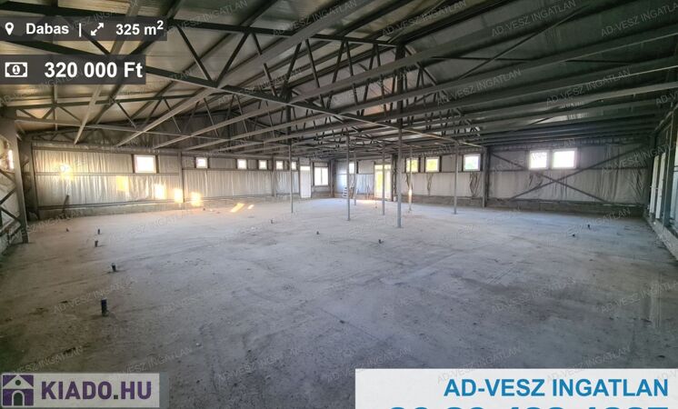 KIADÓ 325M2 raktár / csarnok kiadó Dabas jól megközelíthető, központ közeli helyén, ipari árammal, azonnal költözhetően!