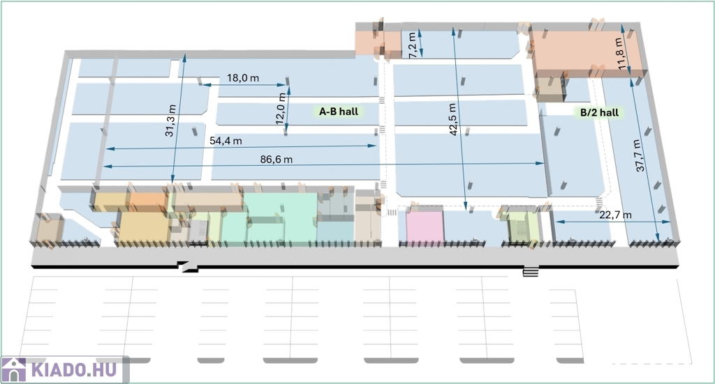 Területmegosztás: A csarnok területe 3 365,05 m2, melyből 2 911m2 gyártó csarnok, 356,7 m2 irodák, 96,8 m2 kiszolgáló és szociális helyiségek. Bővíthető + 1 125m2-el, illetve +1 685m2-el, így akár 6 175m2 tud rendelkezésre állni.