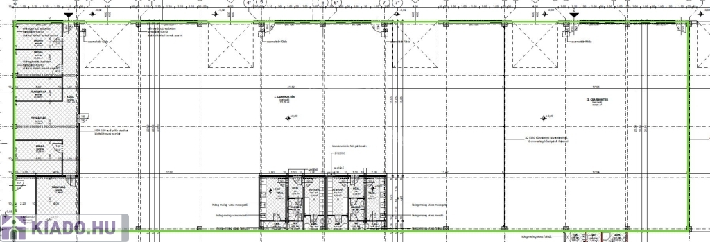 Elosztását tekintve egy csarnoktérből (773m2), egy 111m2-es, 4-5 helyiséges irodablokkból és két darab, egyenként 32m2-es öltözőkkel, teakonyhával és mosdókkal felszerelt szociális blokkból áll.