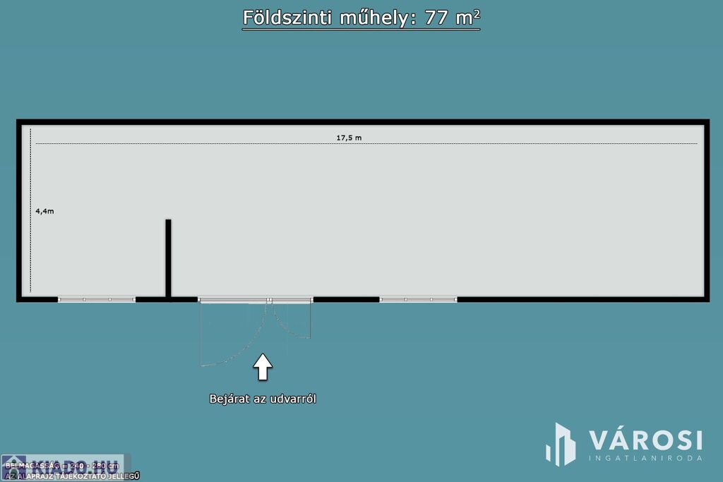 A raktár belső mérete: 17,5 X 4,4 méter. A belmagasság: 240-280 cm.