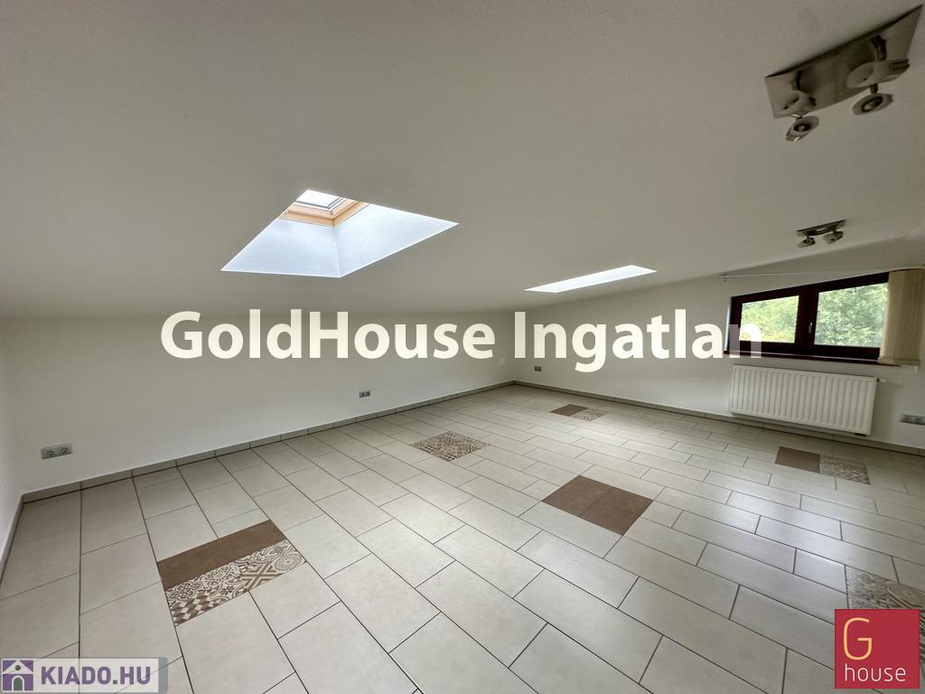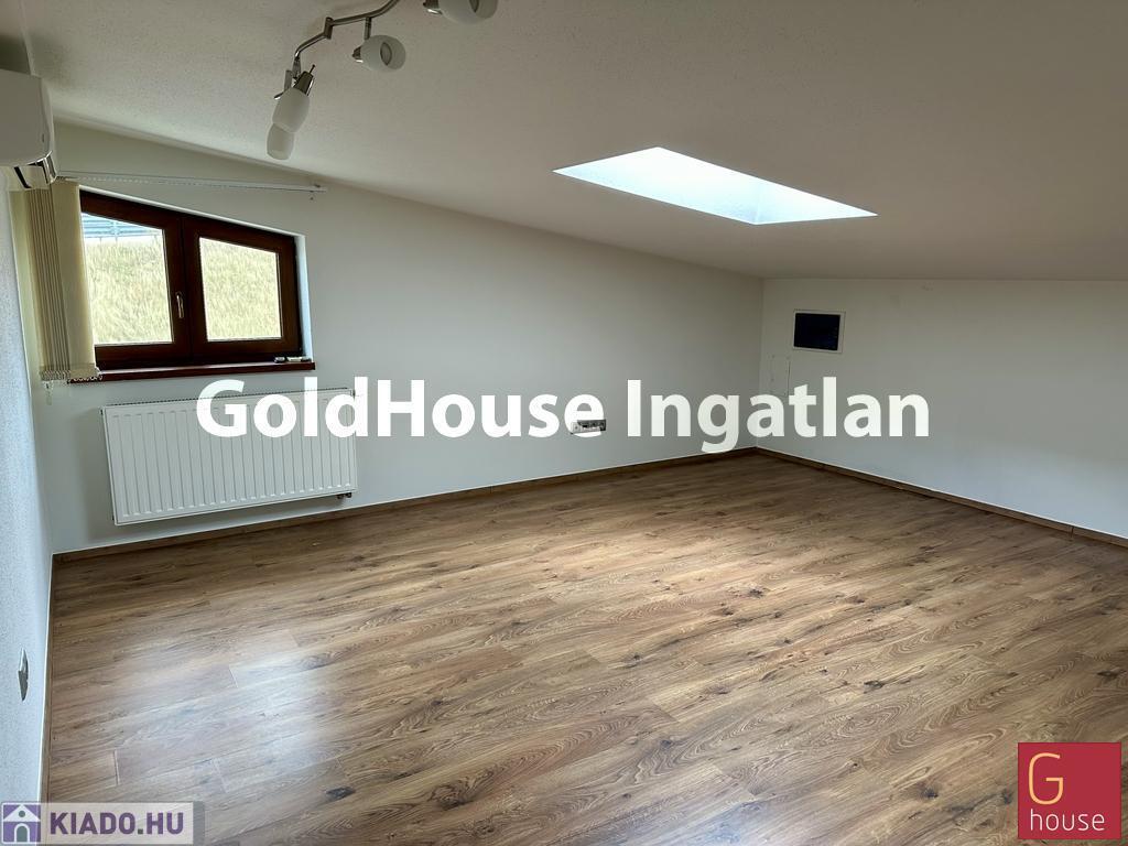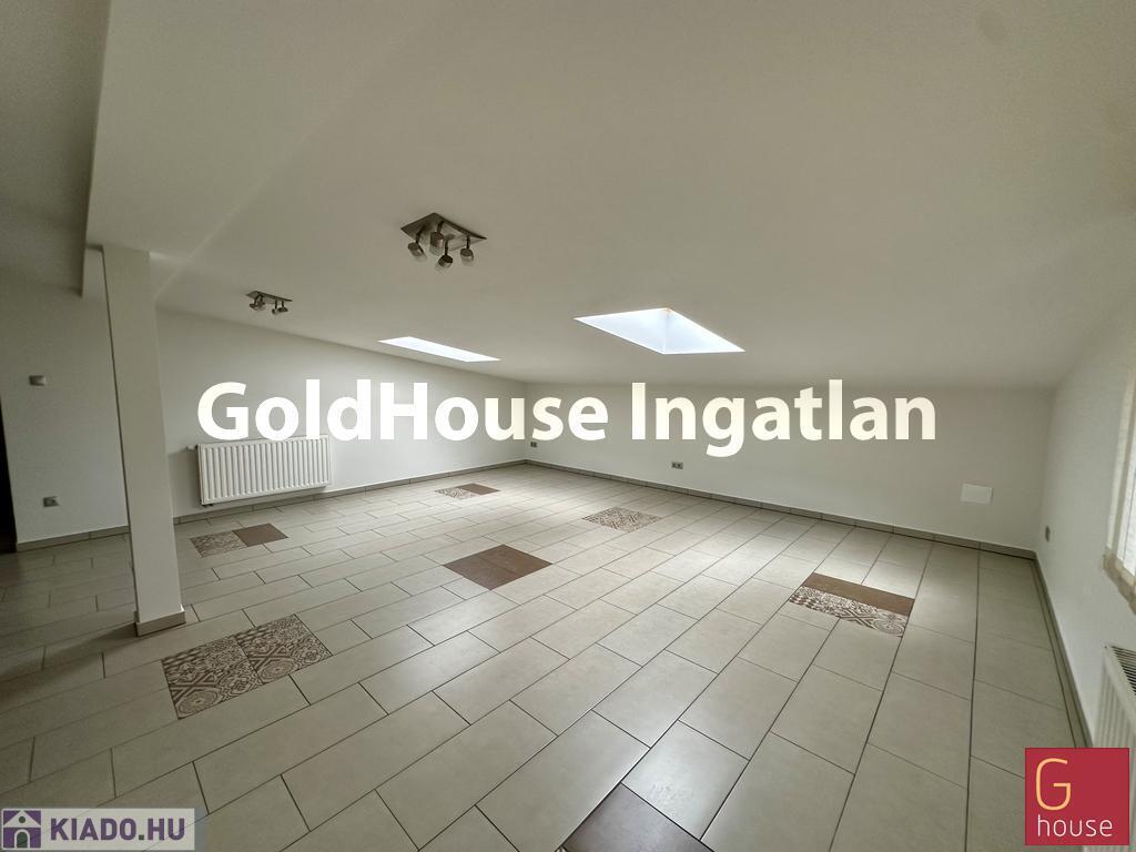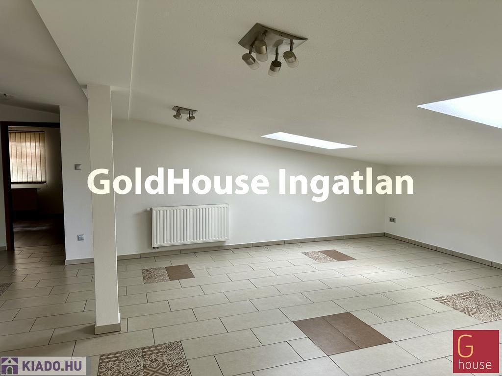 Az első emeleten található helyiség teljes alapterülete 100 m², a tető lejtős kialakítása miatt a hasznos terület 60 m², amely ideális méret kisebb irodai csapatok vagy szolgáltatói tevékenységet végző vállalkozások számára.