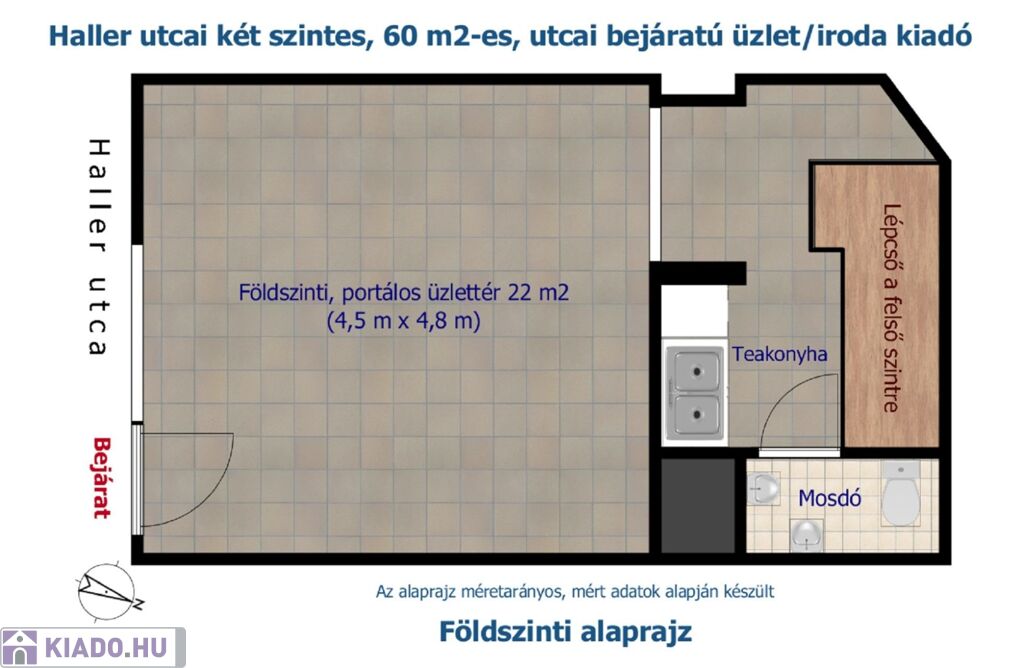 A 31 m2-es földszinten UTCÁRÓL NYÍLÓ, VILÁGOS HELYISÉG, valamint egy teakonyha és mosdó áll rendelkezésre. A 29 m2-es, szintén ablakos felső szintre – az alaprajz szerinti kiépítésben – belső lépcső vezet, mely akár az üzlet elejébe is áthelyezhető.