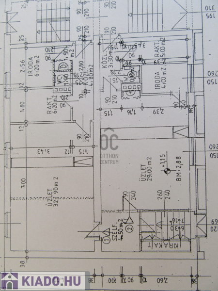 A kb tíz méter utcafronti kirakattal rendelkező ingatlan utcafronti üzlethelyiség része 50 nm, a fallal félig leválasztott belső része 35 nm, a raktár a mosdó-Wc-vel 15 nm. A raktárba pakolás a hátsó parkoló felőli bejáraton keresztül is megoldható.