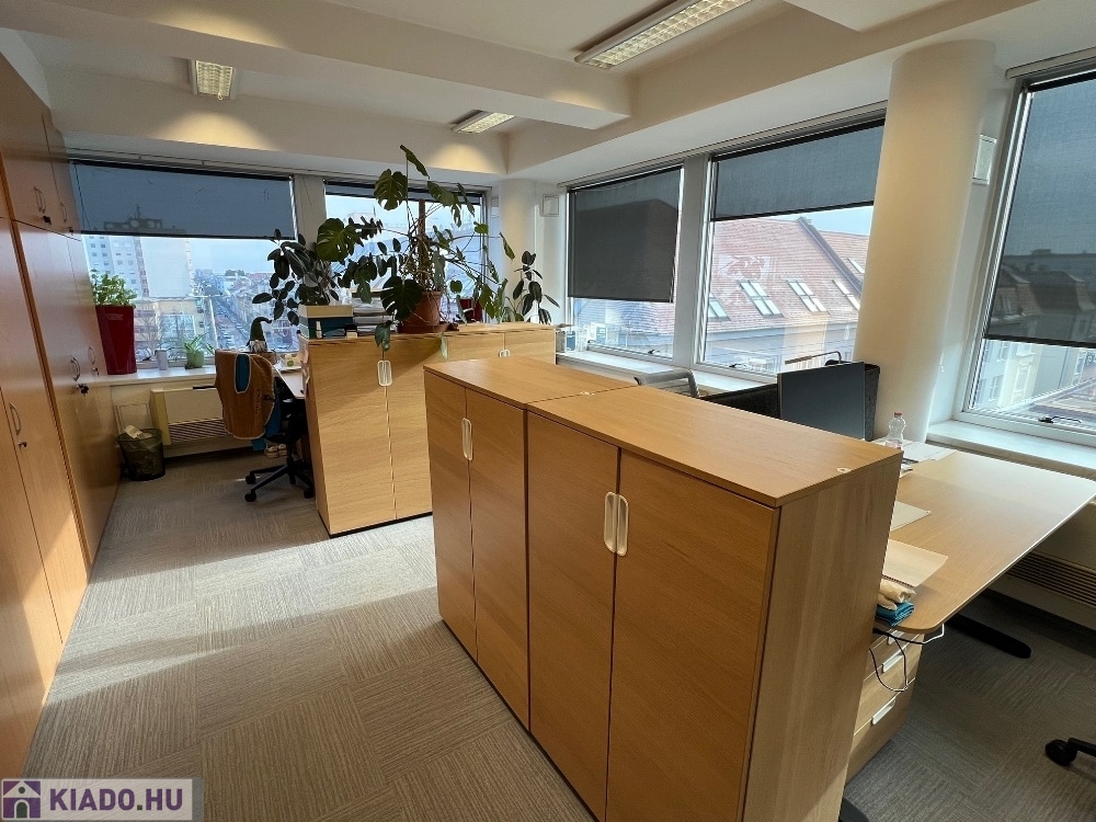 Győr-Belvárosának rendkívül kedvelt részén, Baross úttól, Széchenyi tértől pár másodperces sétatávolságra, rendezett, tiszta, liftes irodaház 5. emeletén, 157 m2-es tárgyalóból és 3 db méretes irodából álló, (17 m2, 26 m2, 29 m2) továbbá saját teakonyhával és szociális egységgel felszerelt, nagy üvegportálos, összesen 306 m2-es bútorozatlan iroda kiadó.