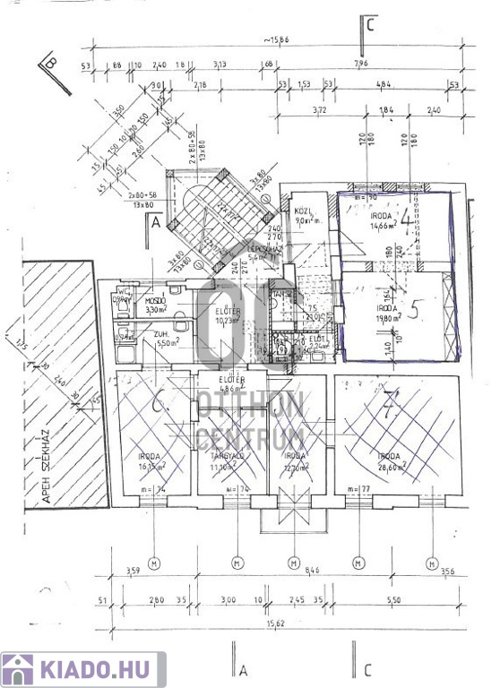 Az alaprajzon a hirdetett iroda a 4-es és 5-ös számú egyben.
