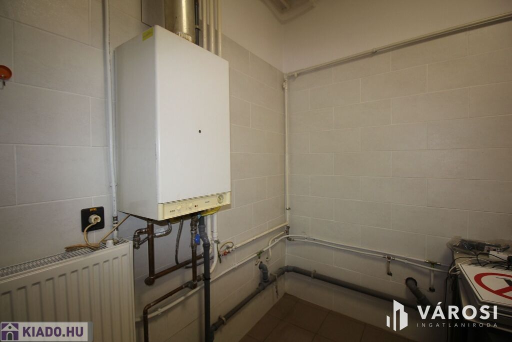 Fűtése gáz-cirkó, a melegvizet bojler biztosítja. A kirakatüvegek hungaropán üvegezésüek, így a rezsiköltség alacsony. A padozat hidegburkolat. Víz, szennyvíz csatorna bekötve. Iroda, 2 mosdó, tusoló áll rendelkezésre. Kamerával, riasztóval felszerelt ingatlan.