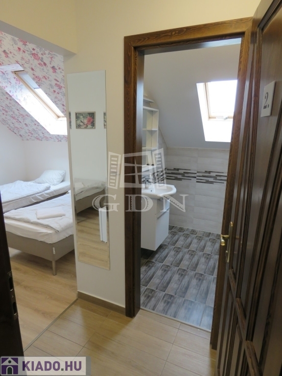 A kétszintes épület emeleten négy (2db 4 ágyas és 2db 3 ágyas), önálló fürdőszobás apartman, illetve egy teakonyha került kialakításra.