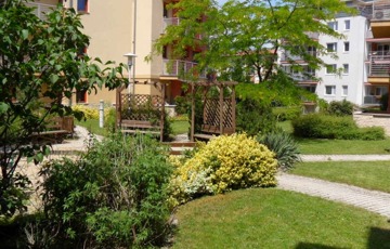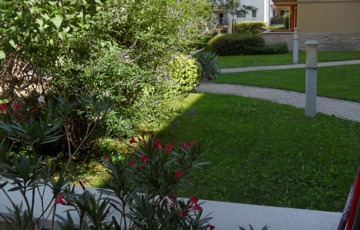 A lakás ablakai és erkélye a ház gondozott, örökzöldekkel és virágokkal beültetett belső kertjére néznek, amelyet kertész ápol. A kert zárt és teljesen védett, így csendes, nyugodt környezetet biztosít.