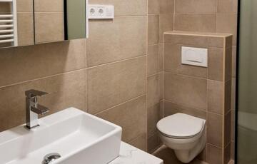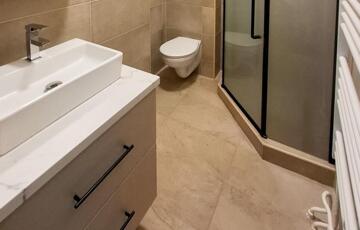 A felújított fürdőszoba modern szaniterekkel és letisztult megjelenéssel rendelkezik.