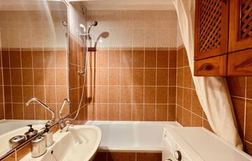 A fürdőszobában kád és törölköző szárító radiátor.